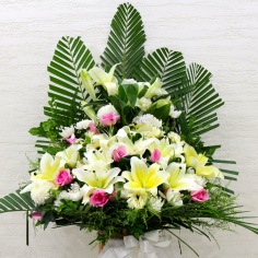 單頭白百合、黃百合、桃紅玫瑰、大波菊、白太陽菊