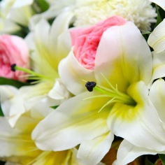 大波菊、綠白掌、百合、粉玫瑰、香檳太陽菊